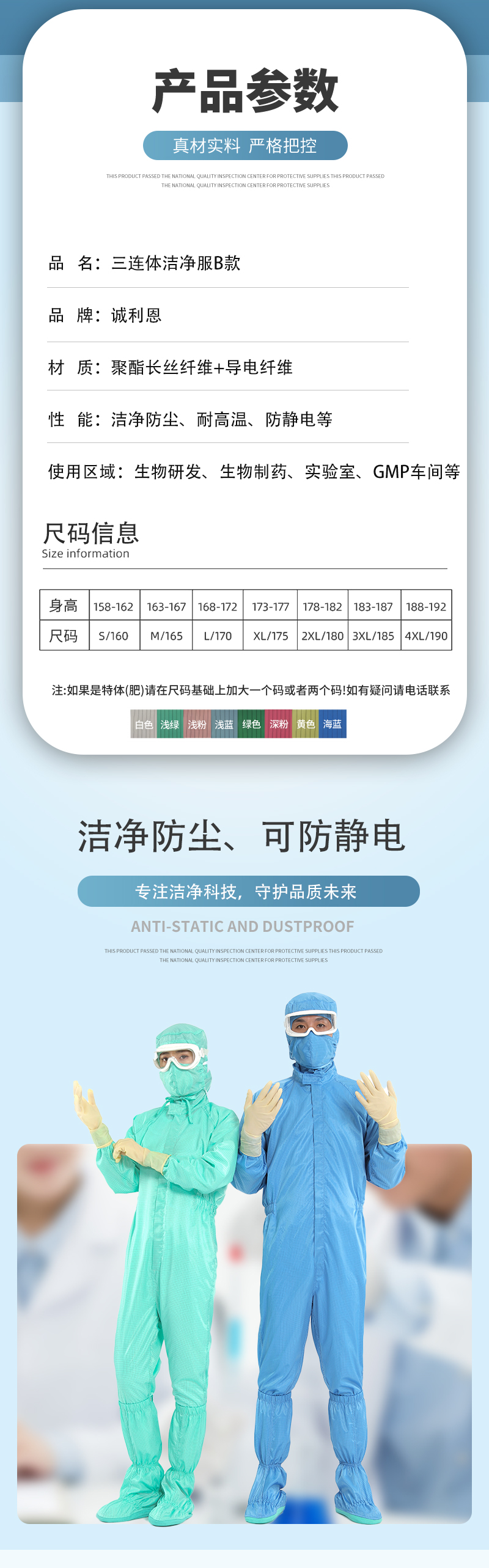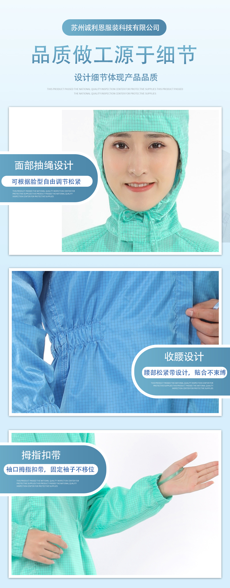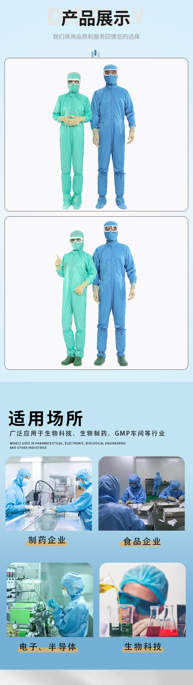 产品性能优势:洁净防尘、阻隔粉尘颗粒物、耐高压湿热灭菌、永久防静电、立体剪裁、不起球、布面光洁